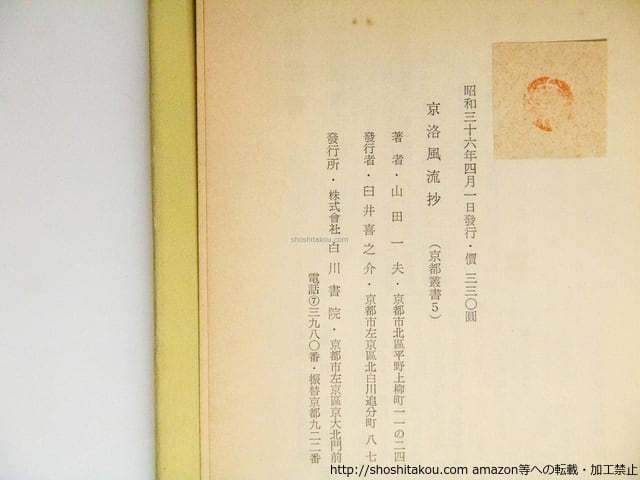 1961 ( 昭和36年 ) 初版・カバー カバイタミ カバーのうら表紙側剥がれ大 白川書院 四六判 京都叢書5 296p 「京洛回顧(随筆)」9篇 「京都幻想(小説)」6篇 並下(極美・美・良好・並・並下・難) (目録番号:-)