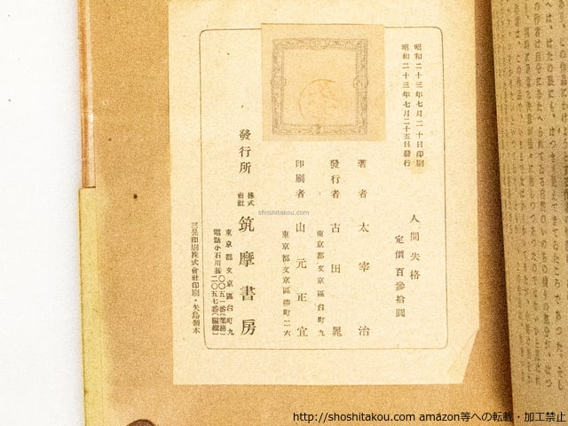 1948 ( 昭和23年 ) 初版・元帯(黄色帯・背の「グッド・バイ」太文字)・濃色表紙・背「筑摩書房」の文字左書・元パラ付(本書帯は元より両見返貼) パラフィン背少欠 仙花紙本として美 帯少シミあれど無傷 筑摩書房 四六判 帯は緑と黄色で二種類、背の「グッド・バイ」の文字が太いもの・細いもので二種類、表紙は色が濃いもの・薄いもので二種類があります 美(極美・美・良好・並・並下・難) (目録番号:10-97)
