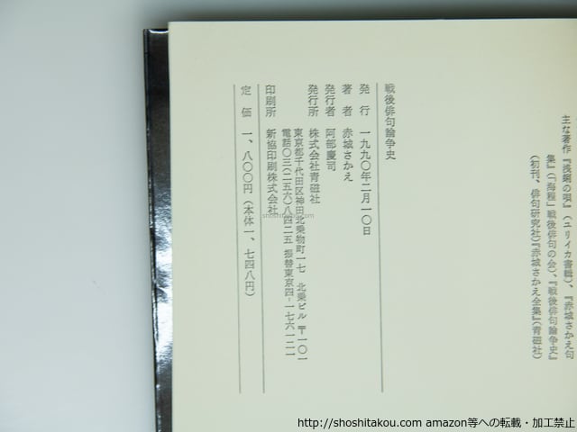 1990 ( 平成2年 ) 再刊版初版・カバー カバ少スレ 天少汚 青磁社 A5判 第二芸術論論争・草田男の犬論争・根源俳句論争・社会性論議の実態 s43俳句研究社刊『戦後俳句論争史』の再刊本 良好(極美・美・良好・並・並下・難) (目録番号:-)