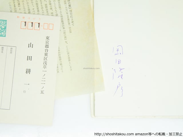 1970 ( 昭和45年 ) 限定300部・初版・函・挟み表紙・本冊総局紙本・日和崎尊夫貼口絵・著者署名入・別刷「詩集『海の翼』刊行によせて 書肆山田一九七〇年七月発足第一回出版(山田耕一)」・愛読者カード付 函少シミ少キズ 本冊極少シミ 書肆山田 B5判変形 第三詩集 書肆山田処女出版 良好(極美・美・良好・並・並下・難) (目録番号:-)