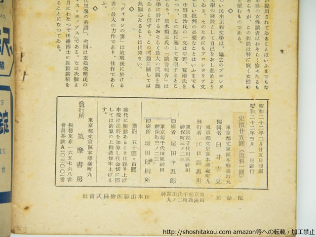 1947 ( 昭和22年 ) ヤケシミ 表紙印 一枚端少キレ 筑摩書房 A5判 小林秀雄「ランボオの問題」 並(極美・美・良好・並・並下・難) (目録番号:-)