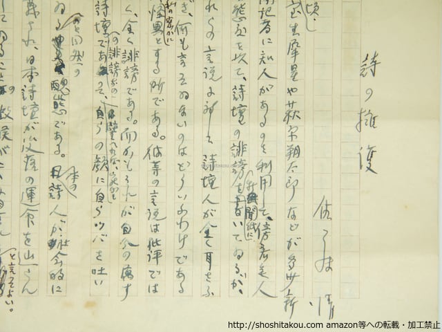戦前 評論「詩の擁護」 ペン書 400字詰原稿用紙6枚完 吉川則比古宛封付(消印不鮮明だが戦前) [近頃、室生犀星や萩原朔太郎などが多少新聞記者に知人があるのを利用して、傍若無人な態度を以て、詩壇の誹謗を新聞紙に書いてゐるが…] (目録番号:-)