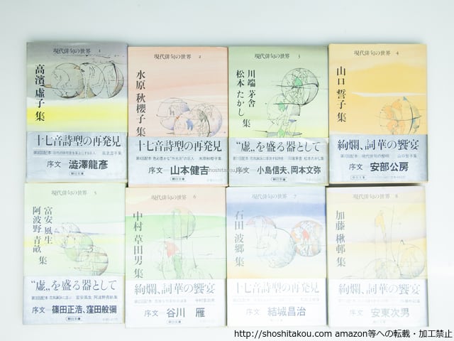 1984-1985 ( 昭和59-60年 ) 初版・カバー・帯揃 本文紙並程度の経年ヤケ 天少シミ 数冊帯キズ 数冊少書込 朝日新聞社 文庫判 1高浜虚子集 2水原秋櫻子集 3川端茅舎・松本たかし集 4山口誓子集 5富安風生・阿波野青畝集 6中村草田男集 7石田波郷集 8加藤楸邨集 9西東三鬼集 10中村汀女・星野立子集 11橋本多佳子・三橋鷹女集 12高浜年尾・大野林火集 13永田耕衣・秋元不死男・平畑静塔集 14金子兜太・高柳重信集 15森澄雄・飯田龍太集 16富澤赤黄男・高屋窓秋・渡辺白泉集 (序文)澁澤龍彦・小島信夫・安部公房・谷川雁・安東次男・馬場あき子・後藤明生・吉岡実・中井英夫・島尾敏雄・井伏鱒二・塚本邦雄・大岡信ほか 並(極美・美・良好・並・並下・難) (目録番号:-)