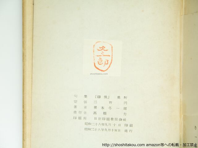 1953 ( 昭和28年 ) 初版・カバー・安住敦宛毛筆署名入 ヤケ シミ カバイタミ 表紙上端齧り傷 高橋力発行 四六判 山口誓子序 並下(極美・美・良好・並・並下・難) (目録番号:-)