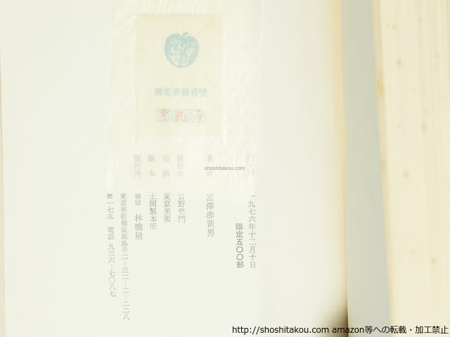 1976 ( 昭和51年 ) 限定500部内「著者本」・初版・函・別冊「雄鶏日記」・栞「富澤赤黄男覚書(高屋窓秋・吉岡実・山中智恵子・鷲巣繁男)」付 函ヤケシミ 本冊三方シミ 書肆林檎屋 A5判 並(極美・美・良好・並・並下・難) (目録番号:-)