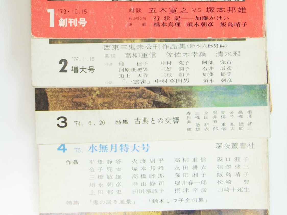 1973-1975 ( 昭和48-50年 ) 少ヤケシミキズ 中央書院・深夜叢書社 B5判 1・2号中央書院発行(編集協力齋藤愼爾)・3・4号齋藤愼爾の深夜叢書社発行 塚本邦雄 葛原妙子 吉岡実 中井英夫 須永朝彦 飯島晴子 高柳重信 河原枇杷男 石井辰彦 加藤郁乎 大原テルカズ 攝津幸彦 永田耕衣 高橋睦郎 他 創刊号表紙つげ義春・他2号から横尾龍彦表紙 並(極美・美・良好・並・並下・難) (目録番号:-)