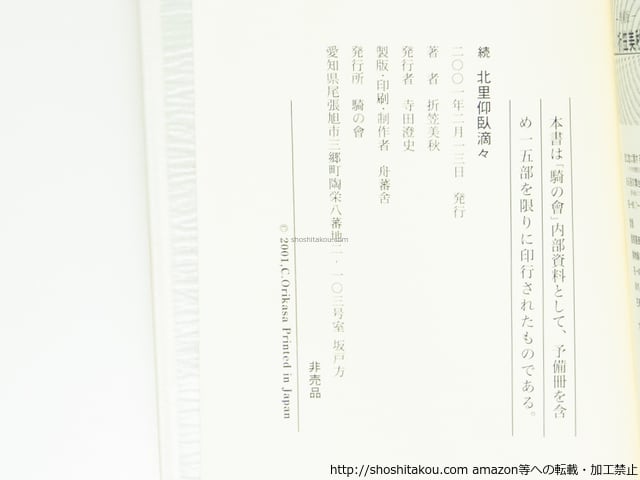 2001 ( 平成13年 ) 非売品限定15部・カバー・上製本 騎の会 四六判 寺田澄史発行「騎の会内部資料として、予備冊を含め15部を限りに印行」 付《折笠美秋俳句評論総目録》増補版 良好(極美・美・良好・並・並下・難) (目録番号:-)