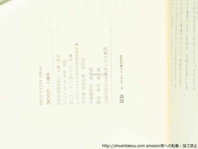 1986 ( 昭和61年 ) 初版・折込装表紙・帯 外観に埃シミ 巻末既刊一覧にチェック有 牧羊社 A5判 処女句集シリーズ 28 第一句集 並(極美・美・良好・並・並下・難) (目録番号:-)