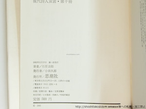 1963 ( 昭和38年 ) 初版・カバー・ビニールカバー カバ端イタミ ビニカバー経年収縮にともなう表紙反り 本書のビニカバ付はこの状態であることが殆ど。 思潮社 四六判 現代詩人双書10 H氏賞 第一詩集 並(極美・美・良好・並・並下・難) (目録番号:-)
