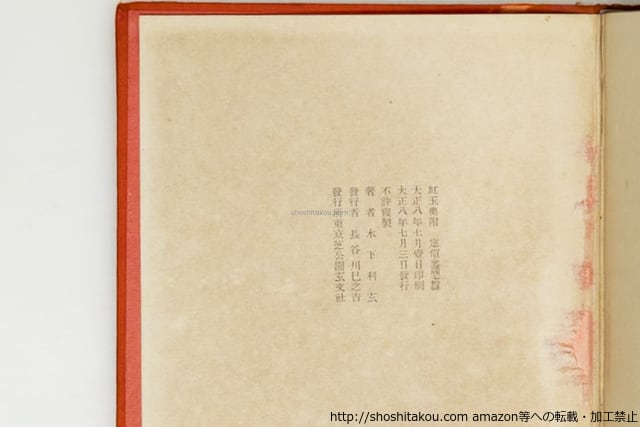 1919 ( 大正8年 ) 初版(7月3日版)・函・天金装 函裏墨記入・函天3cm程欠損部に紙打補修 見返墨花押 遊びに印 扉に印と一行記入 扉の次頁印 うら見返欠 本文朱鉛筆チェック 玄文社 四六判変形 難(極美・美・良好・並・並下・難) (目録番号:-)