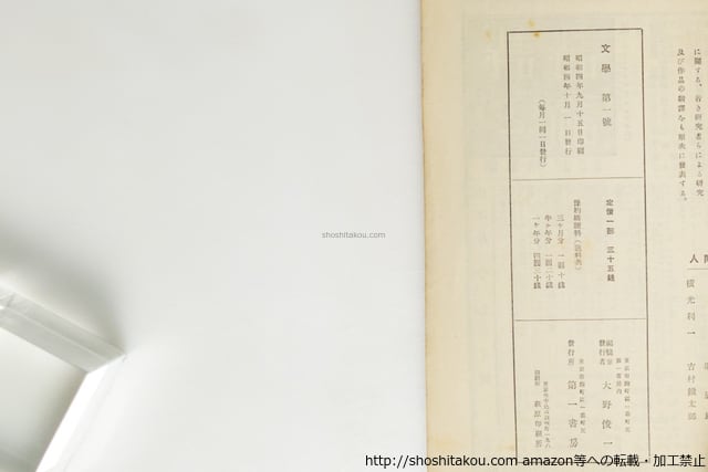 (雑誌)文学 創刊号-6号 6冊 / 堀辰雄 小林秀雄 稲垣足穂 梶井基次郎 瀧口修造 神原泰 横光利一 吉村鉄太郎 中野重治 井伏鱒二 川端康成 西脇順三郎 吉行エイスケ 三好達治 上田敏雄 堀口大學 他 [39620][並]