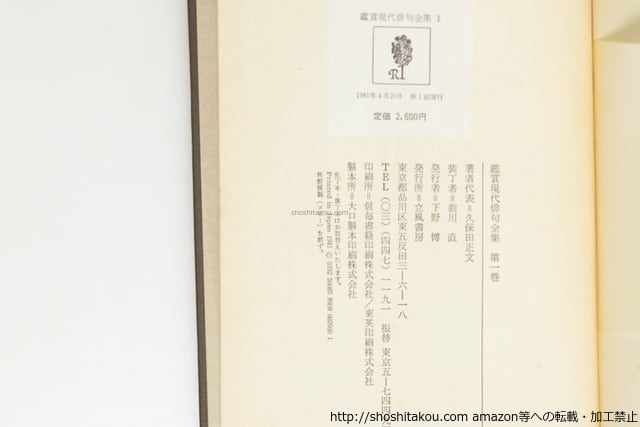 1980-1981 ( 昭和55-56年 ) 初版・函・月報揃 函ヤケシミ 帯イタミ不揃 三方ヤケシミ 月報の背見返しに貼付 2巻扉に「川名」印 川名大書込本。各冊少ないし中程度線引、チェック有。なお1巻に川名大「昭和俳句史(一)」。 立風書房 四六判 【第1巻】 俳句の出発 久保田正文 他 【第2巻】 大正俳句の高峰 飯田蛇笏 他 【第3巻】 自由律俳句の世界 荻原井泉水 他 【第4巻】 近代俳句の先駆者 水原秋櫻子 他 【第5巻】 伝統俳句の魅力 山口青邨 他 【第6巻】 俳句型式の可能性 高屋窓秋 他 【第7巻】 人間内奥の探求 中村草田男 他 【第8巻】 女流俳人の系譜 中村汀女 他 【第9巻】 昭和俳句の開花 大野林火 他 【第10巻】 戦後俳人集 1 平井照敏 他 【第11巻】 戦後俳人集 2 平井照敏 他 【第12巻】 文人俳句集 村山古郷 他 並下(極美・美・良好・並・並下・難) (目録番号:-)