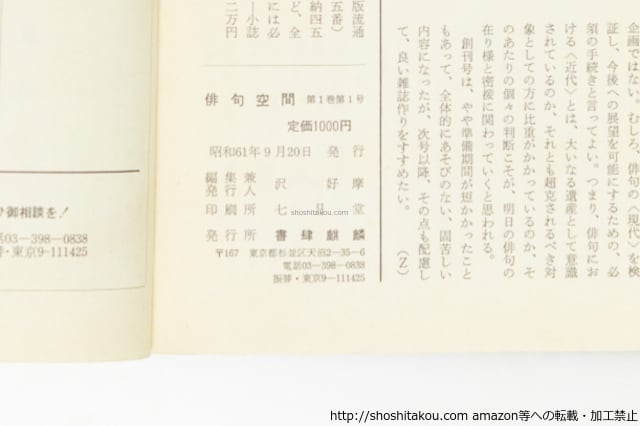 ![(雑誌)俳句空間 創刊号-休刊記念号(23号)内、11冊 / 沢好摩 編発行 [39627][難]](https://baseec-img-mng.akamaized.net/images/item/origin/ac1f79ba9f726e402610bcecd92db187.jpg?imformat=generic)