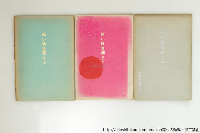 1923-1925 ( 大正12-14年 ) 第7集欠 前から16・10・9・9・10・3・初版 各冊カラー挿絵2葉入 表紙イタミ 内5冊の表紙・見返・扉などに尋常高等小学校印・書票有 赤い鳥社 A5判 並下(極美・美・良好・並・並下・難) (目録番号:-)