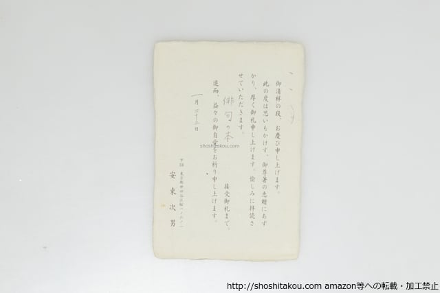 2000 ( 平成12年 ) 川名大宛 和紙葉書 表面ペン書 うら面献本御礼定型文印刷に、書名手書 良好(極美・美・良好・並・並下・難) (目録番号:-)