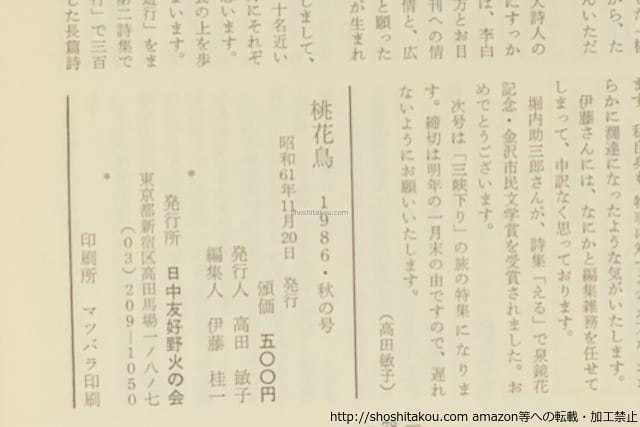 ![(雑誌)桃花鳥 NO.2・4・5 3冊 / 高田敏子 発行 伊藤桂一編集 鈴木亨 内田恵美子 他 [39689][並]](https://baseec-img-mng.akamaized.net/images/item/origin/303cc3f9c23b247f8b6497b3c92a98f6.jpg?imformat=generic)