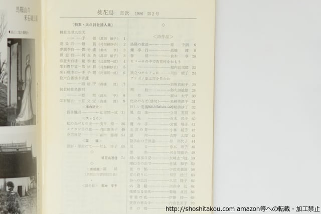 ![(雑誌)桃花鳥 NO.2・4・5 3冊 / 高田敏子 発行 伊藤桂一編集 鈴木亨 内田恵美子 他 [39689][並]](https://baseec-img-mng.akamaized.net/images/item/origin/303cc3f9c23b247f8b6497b3c92a98f6.jpg?imformat=generic&q=90&im=Resize,width=300,type=normal)