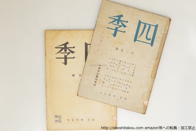 1942 ( 昭和17年 ) 同人の鈴木亨旧蔵 自身の「物象詩集」(丸山薫)評に5頁分書込 背に紙打・シール貼 鈴木亨蔵書印入で同じシールの貼ってある四季復刻本1冊お付けします 四季社 A5判 並(極美・美・良好・並・並下・難) (目録番号:-)