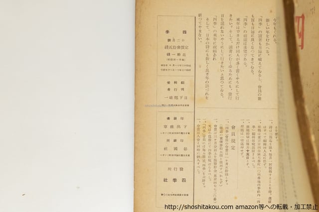 1938 ( 昭和13年 ) イタミ 背テープ補修 少書込 表紙に鈴木印(四季同人の鈴木亨旧蔵) 四季社 A5判 丸山薫・津村信夫・立原道造・田中冬二・小高根二郎 他 難(極美・美・良好・並・並下・難) (目録番号:-)