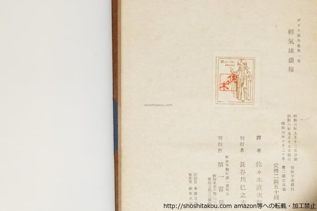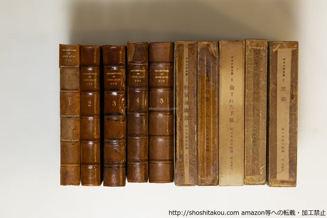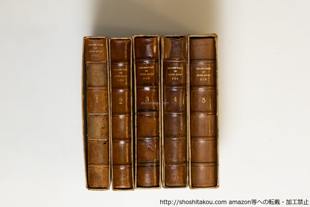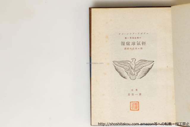1931-1933 ( 昭和6-8年 ) 1巻のみ初版の翌月発行2刷500部(造本同一と思われる)、2-4巻初版(2巻1200部、他1000部)・函揃・背コーネル革五段マウント天金装 全冊函ヤケイタミテープ補修・扉に印・革装イタミ(背強し・剥落有) 第5巻見返蔵書票貼 難有だが、これくらい傷んでいるものが多い(函がきつく革装と干渉するものと思われる) 第一書房 四六判 1:軽気球虚報 2:群集の人 3:偸まれた手紙 4:妖精の島 5:黒猫 難(極美・美・良好・並・並下・難) (目録番号:-)