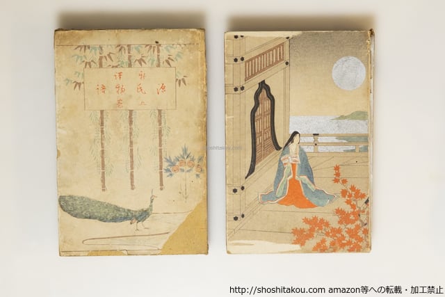 1912-1913 ( 明治45年-大正2年 ) 天金装 中巻以外初版 本書の通例並程度の状態 【上巻】初版・函地欠ヤケイタミ 本冊背はずれ和紙打補修・表紙剥 【中巻】再版・函ヤケ糊補修感 本冊表紙剥・背ヤケ 【下巻の一】初版・函欠 背・表紙少イタミ 【下巻の二】初版・函欠 背上3cm程欠 背ヤケ 表紙少イタミ 上巻:木版口絵1葉・木版挿絵21葉揃 中巻:木版口絵1葉・木版挿絵18葉揃 下巻の一:木版口絵1葉・木版挿絵10葉揃 下巻の二:木版口絵1葉・木版挿絵9葉揃 金尾文淵堂 A5判 源氏54帖に各1点以上多色刷木版挿絵入(本文のない「雲隠」除く。「若菜」は上下に各1葉入。「東屋」「浮舟」「手習」に2葉入。挿絵計57葉。加えて各巻口絵1葉。全61葉) 森鴎外・上田敏序 並(極美・美・良好・並・並下・難) (目録番号:-)