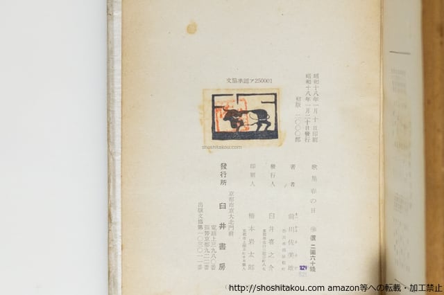 1943 ( 昭和18年 ) 初版・カバー カバ少イタミ 背ヤケ 三方ヤケ 臼井書房 四六判 「第一歌集」とあるが刊行順で第五歌集 『植物祭』以前の作 並(極美・美・良好・並・並下・難) (目録番号:-)