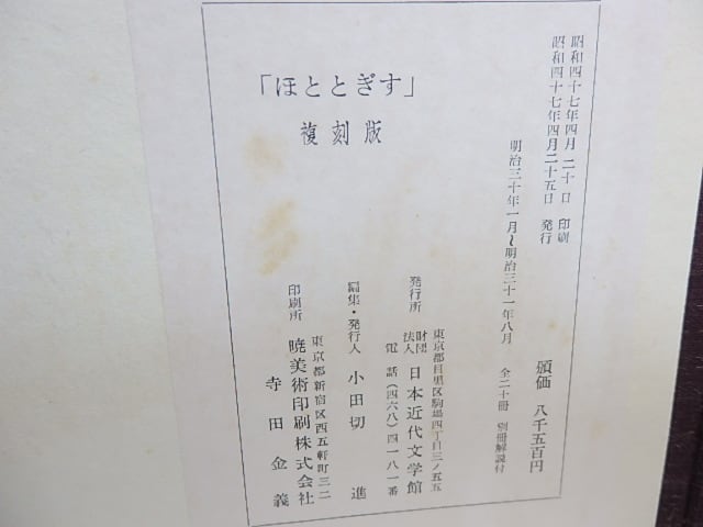 1972 ( 昭和47年 ) 復刻版・輸送函・帙・本冊20冊・別冊解説付 輸送函にヤケイタミ題書き入れ 日本近代文学館 A5判 (ほとゝきす) (目録番号:-)