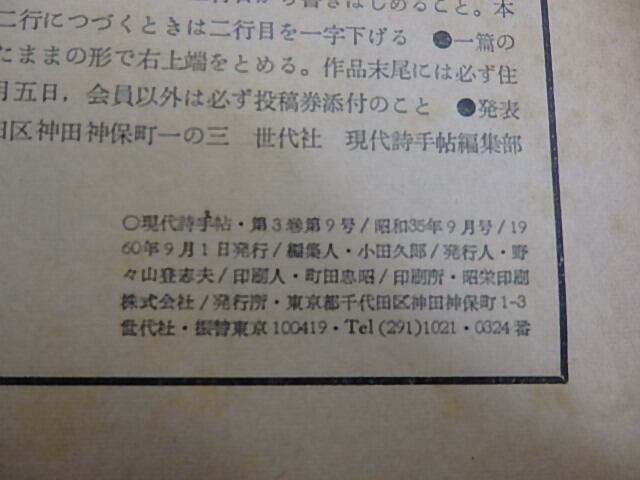 1960 ( 昭和35年 ) 背少欠 一枚角少欠 世代社 A5判 特集・現代詩六つの問題点 特集・なぜ詩を書かねばならないか (目録番号:-)