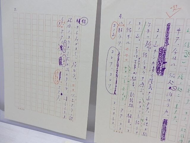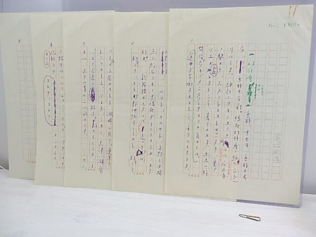 多色ペン書 200字詰原稿用紙5枚完 無題ですが芭蕉についての内容 近年の散文的詩作品といった印象です 本人筆に疑いありませんが、鉛筆の署名部のみ編集者の代筆かもしれません 「幻住庵  五時、十七日、五時十七分、  五時十分前。場処幻住庵ノ跡 ニ辿リツイタ。神社ノワキノヨウナ所  石山寺ノ駅カラ、…」       (目録番号:-)