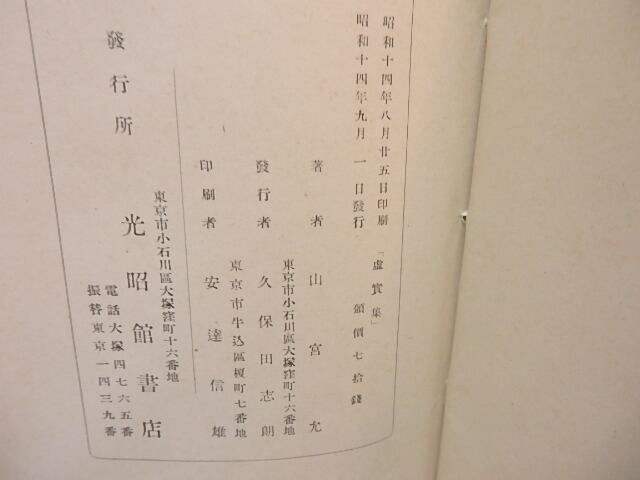 1939 ( 昭和14年 ) 初版・カバー・本冊元紐綴 カバイタミ 光昭館書店 四六判 歌集 58p 含「『地球を弔ふ』の著者中山忠直君に寄せて歌へる」 (目録番号:-)