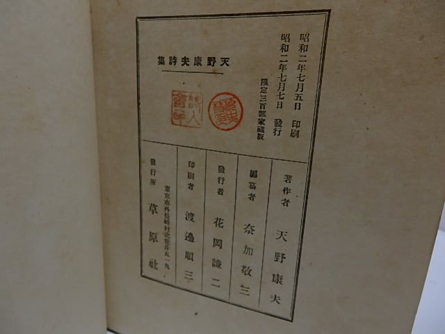 1927 ( 昭和2年 ) 家蔵本限定300部・天金装裸本 少スレ汚 扉に書込 並 草原社 四六判 遺稿詩集 萩原朔太郎序 井上康文跋 奈加敬三後記 (目録番号:-)