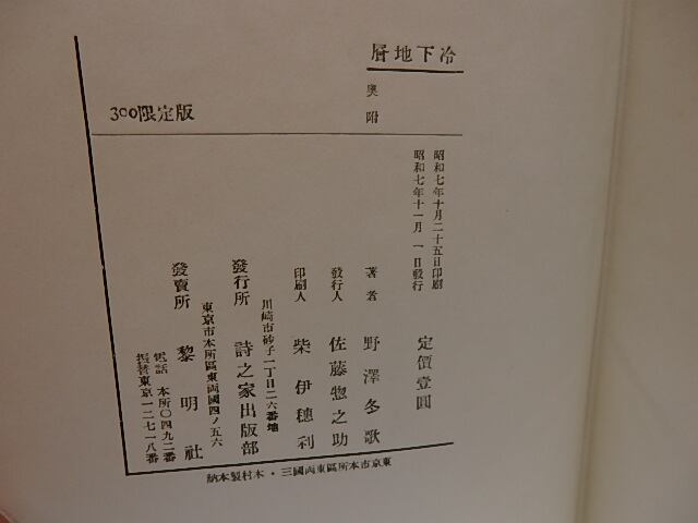 詩集 冷下地層 / 野澤冬歌 恩地孝四郎装 [28615]