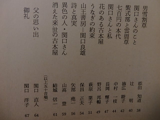 1978 ( 昭和53年 ) 三茶書房 A5判 71p 尾崎一雄・小田切進・加藤楸邨・上林暁・木山みさを(木山捷平夫人)・久保田正文・添田知道・野呂邦暢・萩原葉子・山高登他 関口直人・洋子跋 略歴 (目録番号:-)