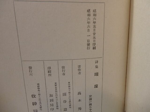 詩集 端座 署名箋付 / 高木秀吉 [26580]