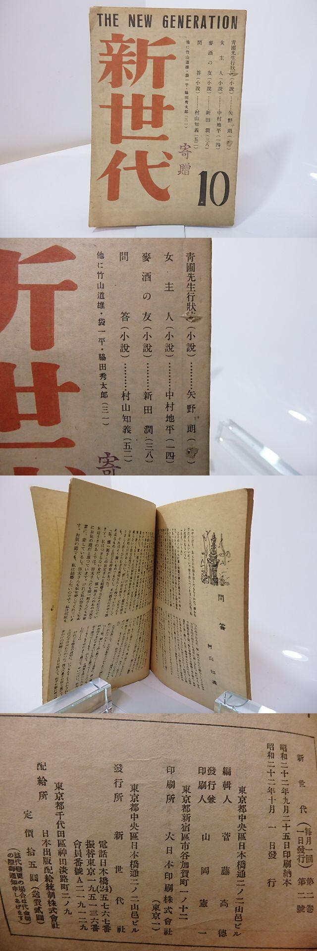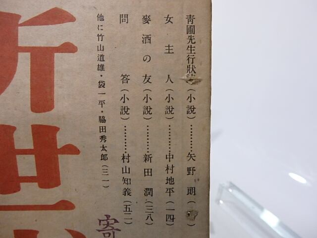 1947 ( 昭和22年 ) 新世代社 四六判 村山知義「問答」 新田潤「麦酒の友」 中村地平「女主人」 矢野朗「青圃先生行状誌」 (目録番号:-)