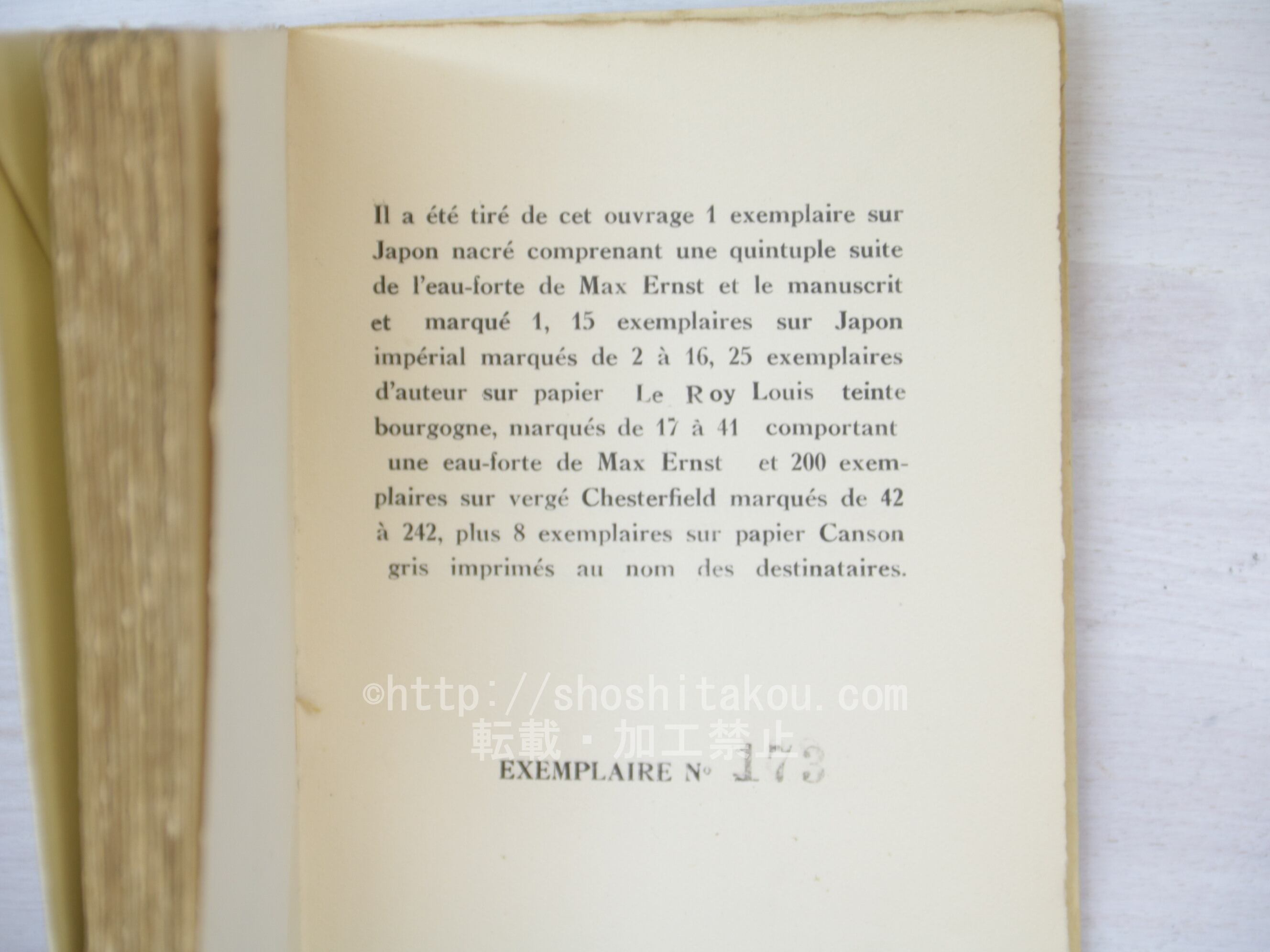 1936 ( 昭和11年 ) パリのエディション・シュルレアリストからナンバー入で200部発行 ペレの詩の英訳などを行ったイギリスのシュルレアリスト、David Gascoyne宛識語署名入 背に些少のヤケキズ・見返にテープシミあるが、全体的に恵まれた保存 Editions surrealistes(Paris) 小型本 Daniel-Henri Mercher装 (目録番号:3-7)