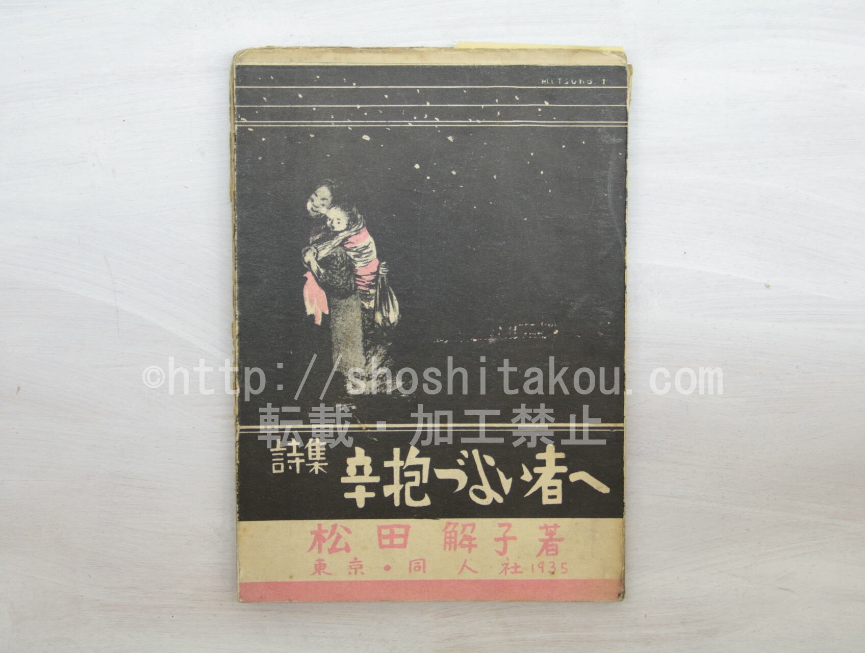 1935 ( 昭和10年 ) 初版・折込装表紙 背少キズ 中扉に印一つ 削除頁の前におそらく発禁箇所の詩文三行鉛筆書入れ 良好 同人社書店 四六判 新井光子装 第一詩集  発禁削除本(p5-6欠)    (目録番号:3-19)