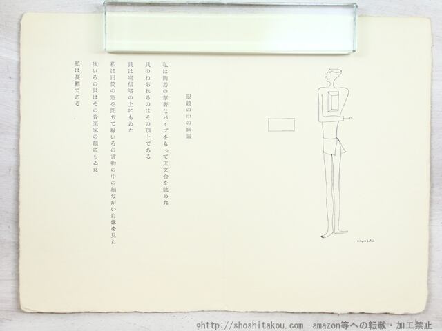 1965 ( 昭和40年 ) プレス・ビブリオマーヌ 四六判 限定195部 和紙二つ折一枚 北園克衛挿絵一点、詩一篇 コレクション・サフィールの1冊だが、著作目録では21番目の詩集に数えられている (目録番号:5-12)