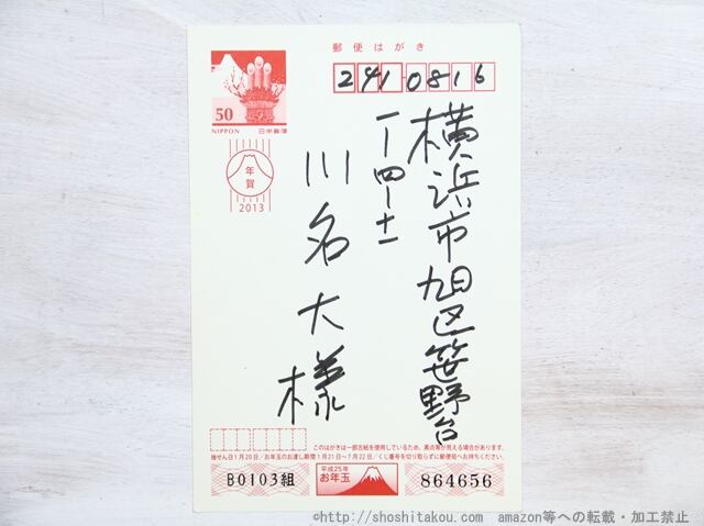2013 ( 平成25年 ) 川名大宛 2013年賀葉書消印なし 裏面印刷に加えペン書で「元気に。」 表面ペン書(差出住所は裏面) (目録番号:5-488)