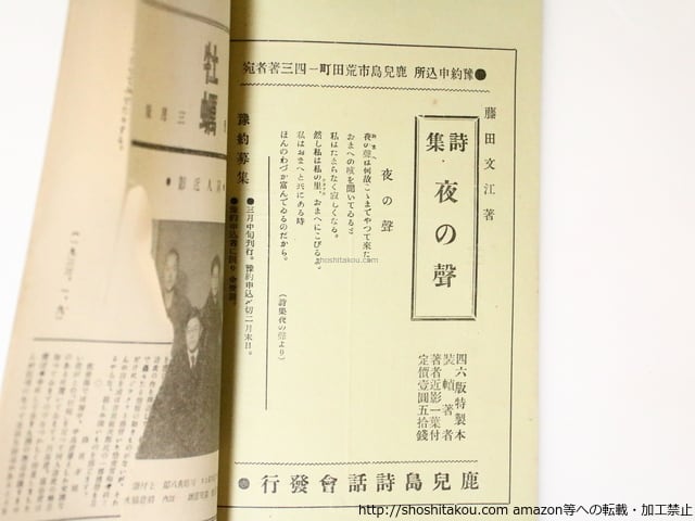 1933 ( 昭和8年 ) 詩と創作社(佐世保) A5判 藤田文江詩「疾む」 見返藤田文江詩集「夜の聲」発売広告 他 12p (目録番号:-)