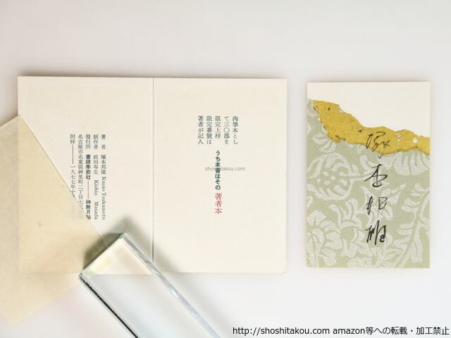 1977 ( 昭和52年 ) 限定30部内著者本・ボール函・肉筆題箋付桐函・布帙・未綴本・破り継ぎの和紙に肉筆歌十二葉・肉筆扉一葉・肉筆署名一葉揃 季節社の政田岑生のペン書添状一枚(便箋に二行) 外ボール函に経年シミ 他、概ね美 書肆季節社 小型本 美(極美・美・良好・並・並下・難) (目録番号:8-92)