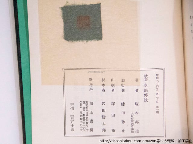 1961 ( 昭和36年 ) 初版・函・毛筆歌ペン署名入「愛するときも然らざる夜も靑年の肩にひるがほほどのくぼみ 塚本邦雄」 函少ヤケ 帯欠 白玉書房 四六判 第四歌集 良好(極美・美・良好・並・並下・難) (目録番号:-)